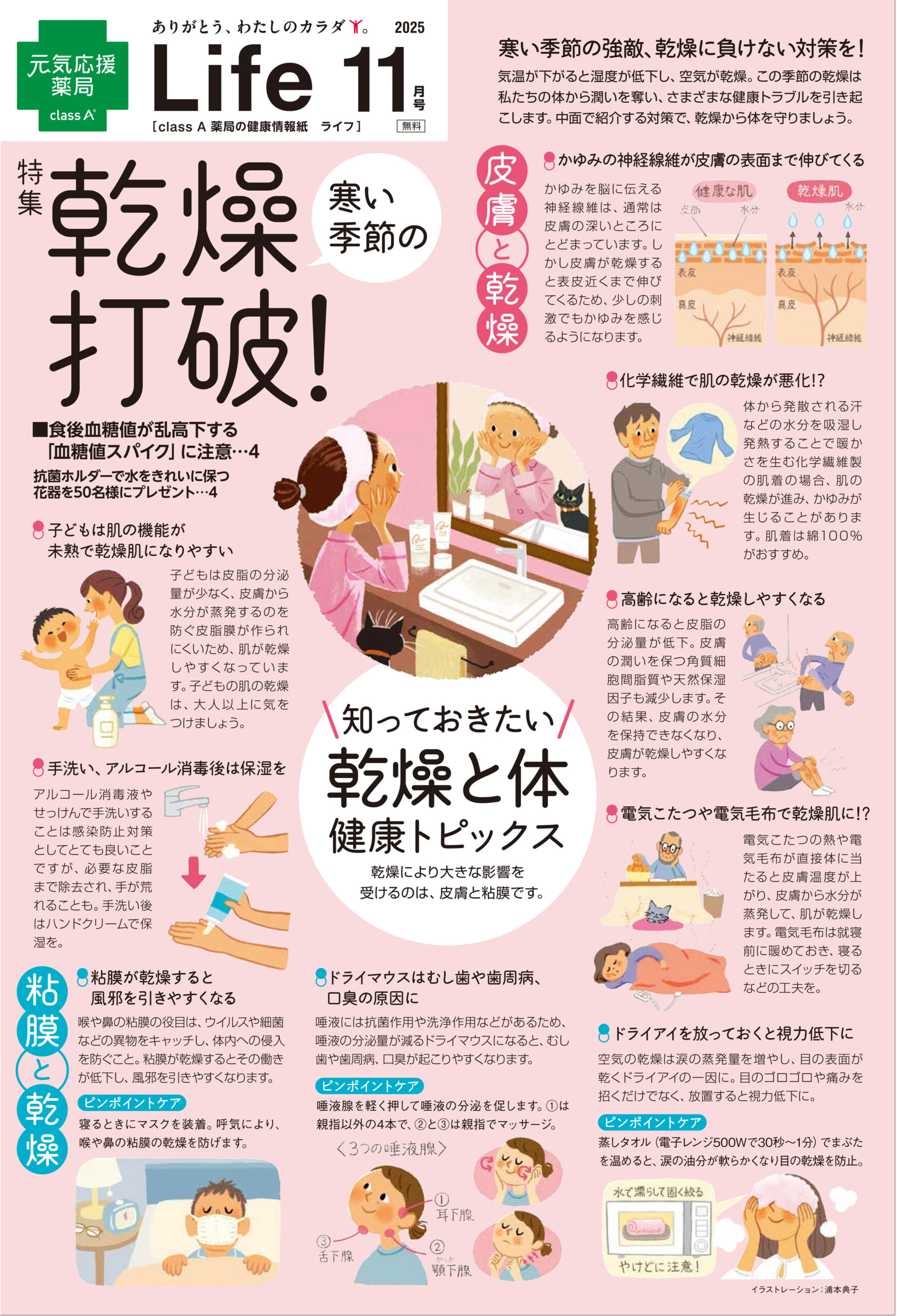 気温が下がると湿度が低下し、空気が乾燥。この季節の乾燥は私たちの体から潤いを奪い、さまざまな健康トラブルを引き起こします。中面で紹介する対策で、乾燥から体を守りましょう。